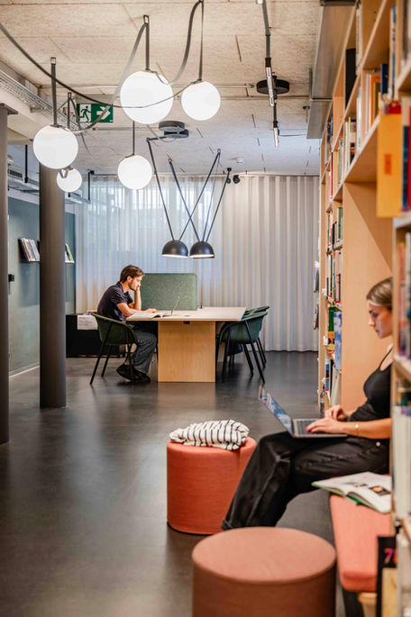 Architektur und Imagebilder mit Studierenden in der neu gestalteten Bibliothek am Pädagogischen Hochschulinstitut NMS Bern.
